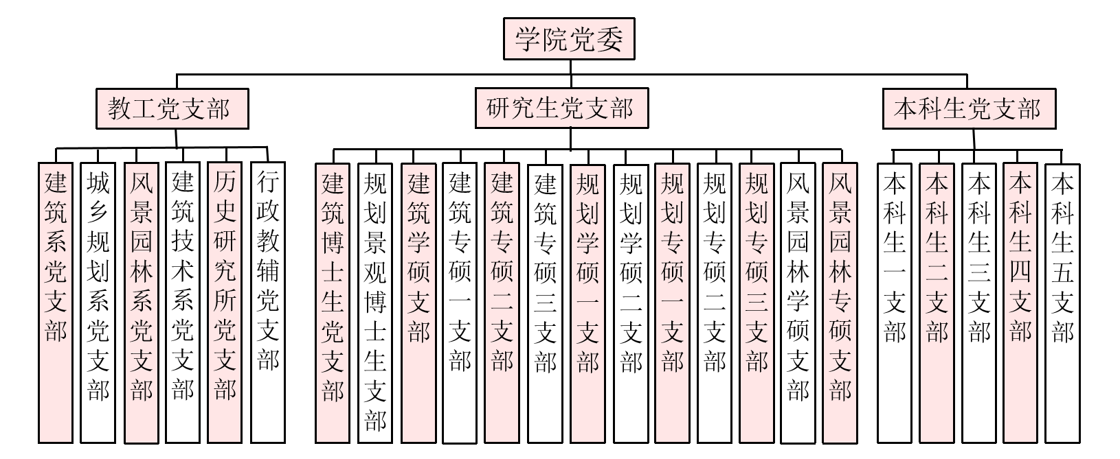 中共重庆大学建筑城规学院委员会现下设24个党支部,其中教职工党支部6个,研究生党支部13个,本科生党支部5个。学院党委现有党员567名,其中教工党员104名,学生党员463名。